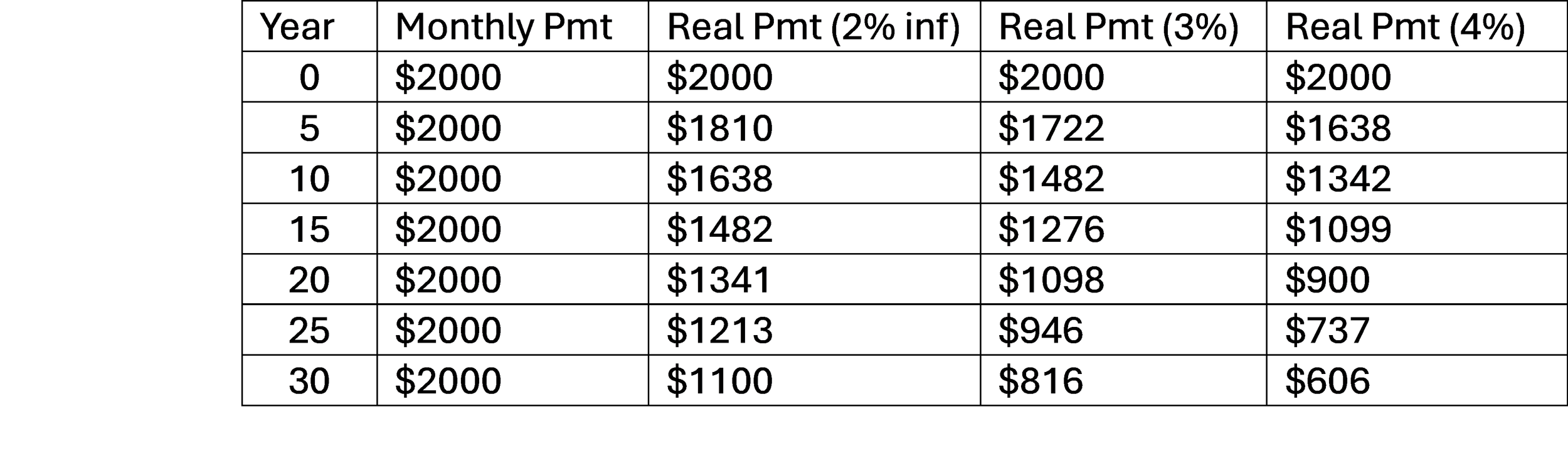 Sadly, this father struggled to “cheer” at the family dinner table when the mortgage payment became just a little cheaper (almost 3% cheaper) in real terms during the past 12 months. Why?!! There’s lots of reasons, of course, but I really want to focus on the speed of change – or lack thereof. While our mortgage stays the same from month to month, the real value of the monthly payment is falling at a very slow rate…so we can’t ‘see’ it clearly enough to include the fact in our intuitive decision-making. If we don’t include the “benefit” of inflation in our decision-making when we contemplate, for example, an early mortgage payment, we’re setting up for a suboptimal decision…at the very least, an incomplete analysis of the decision. Look at this hypothetical case: Assume a 30-year fixed rate mortgage with payments of $2000/mo. In the table’s column 1, you can see how far along we are (in years). In column 2, you can see the nominal monthly payment (it never changes). In columns 3, 4, and 5, we’re adjusting the actual monthly payment downward to describe the future payment in real (present day) terms if assumed rates of inflation are 2%, 3%, and 4% during the life of the loan.